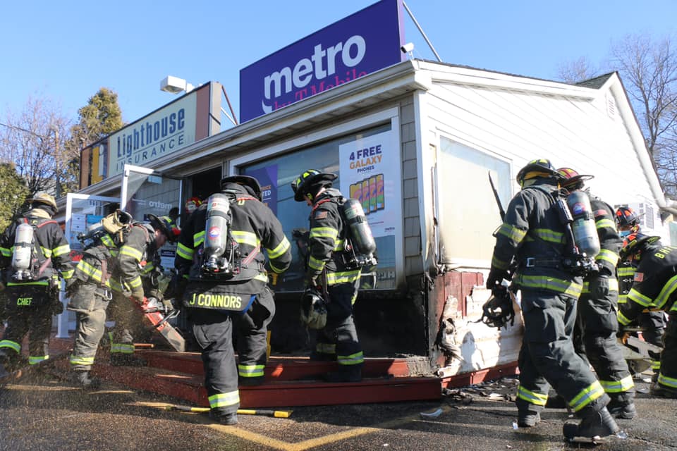Mastic NY: Firefighters from the Mastic, Brookhaven and Mastic Beach Fire Departments responded to a fire at the T-Mobile store 960A Montauk Highway in the…