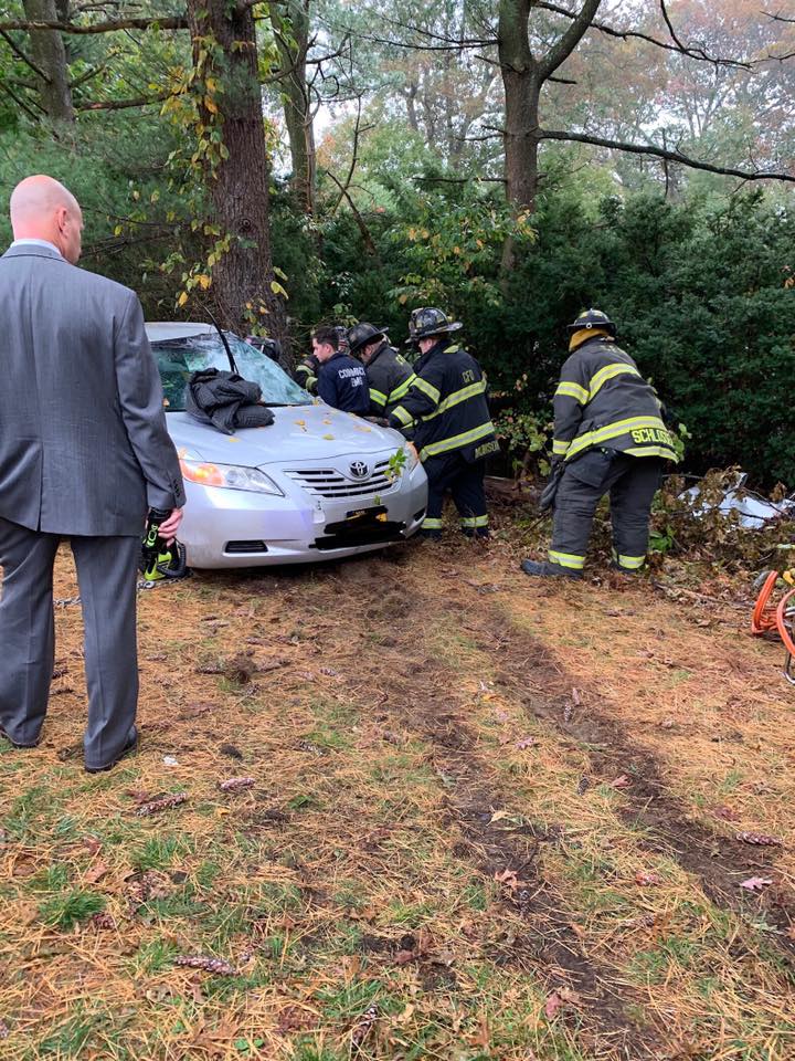 October 29, 2021 1530 hours. Commack Ambulance and Commack Fire Department were dispatched to a report of a car into woods on the exit ramp of the Sunken Meadow State Parkway. Units arrived to find that a passenger vehicle left the roadway, coming to rest along the woods line. Commack FD personnel extricated the occupant from the vehicle while EMS personnel stabilized. CVAC then transported the patient to Southside Hospital with minor injuries. Photos courtesy of CVAC.