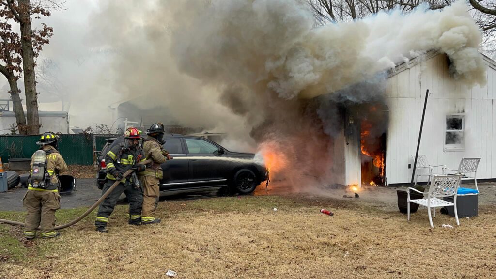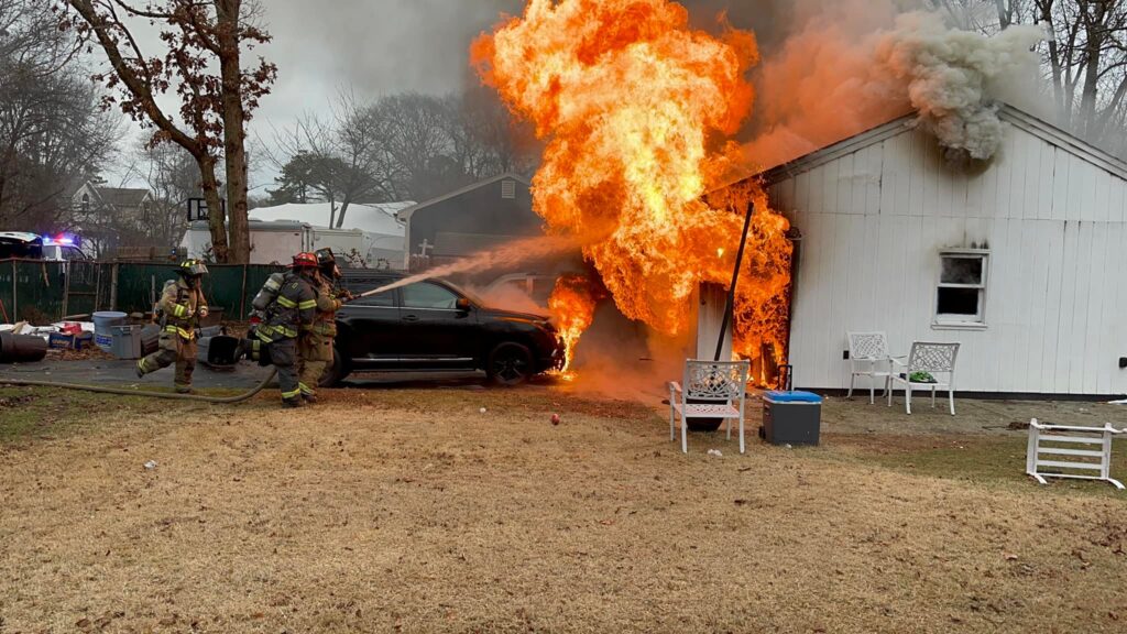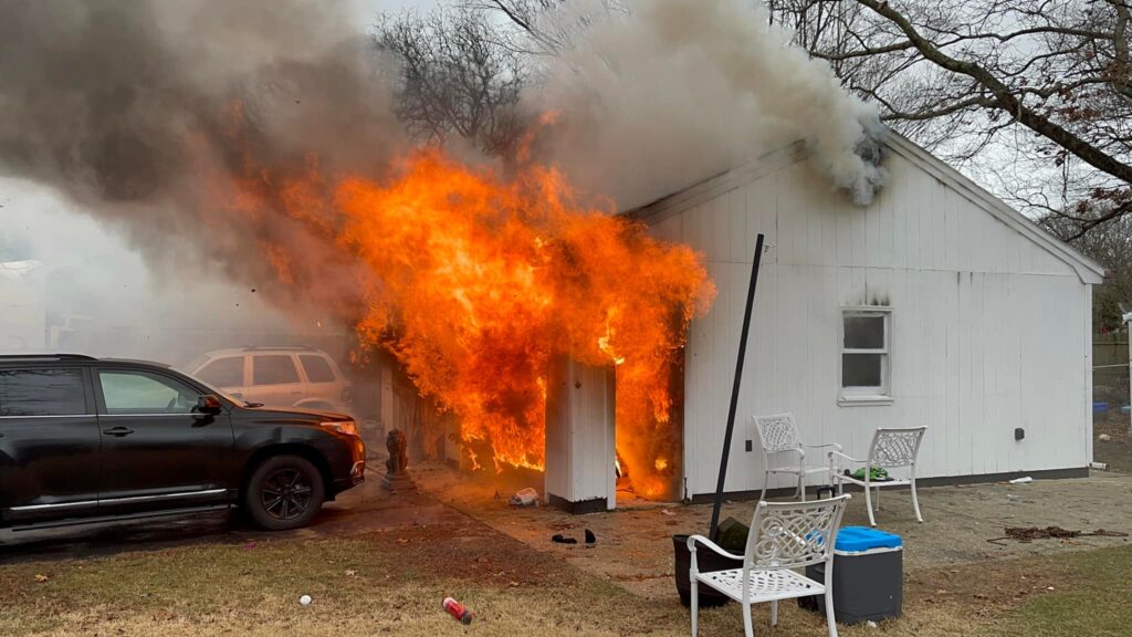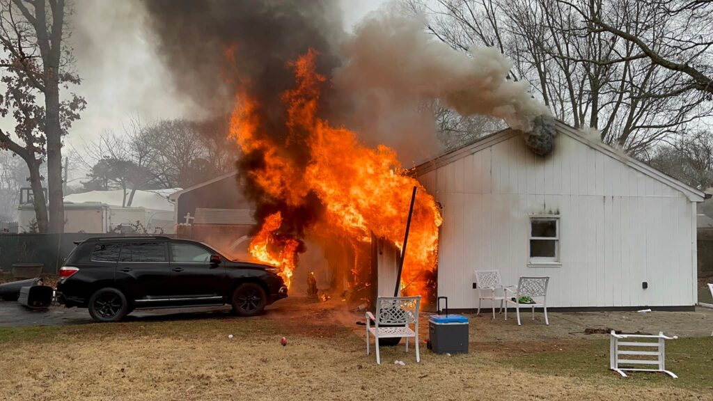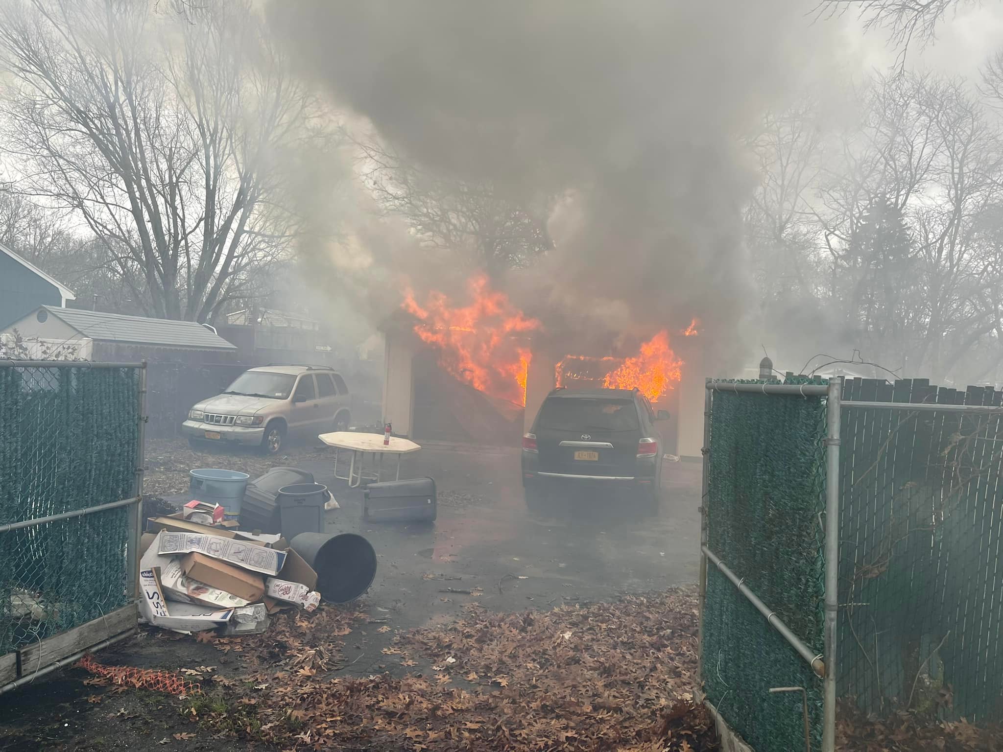 January 17, 2022 1200 hours. The Mastic Fire Department is dispatched to a report of a garage on fire at 47 Woodcut Drive in the former Village of Mastic Beach. Units arrived to find fire venting out of a single story two bay garage. Engine 5-12-1 was first to arrive and stretched two hand lines, knocking down the fire and protecting the exposures. Mutual aid was provided by the Mastic Beach, Brookhaven, Center Moriches and East Moriches Fire Departments at the scene. The Yaphank Fire Department sent an engine to cover the district during the fire. Mastic Ambulance and Shirley Ambulance sent ambulances and covered rehab. The fire investigation is being handled by the Town of Brookhaven Fire Marshals Office and the Suffolk County Police Department Arson Squad. Photos from the Mastic Fire Department Facebook Page.