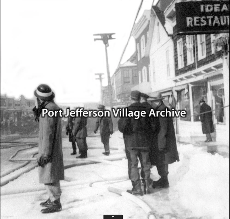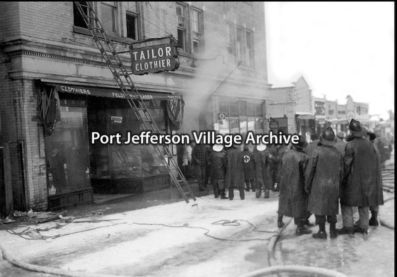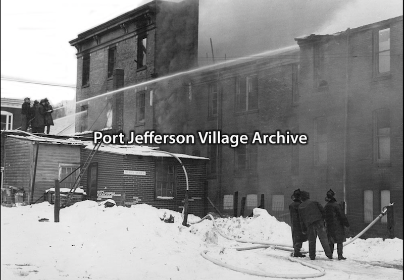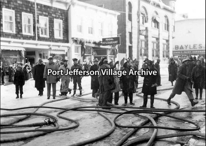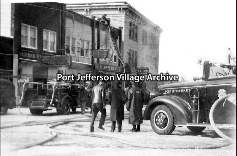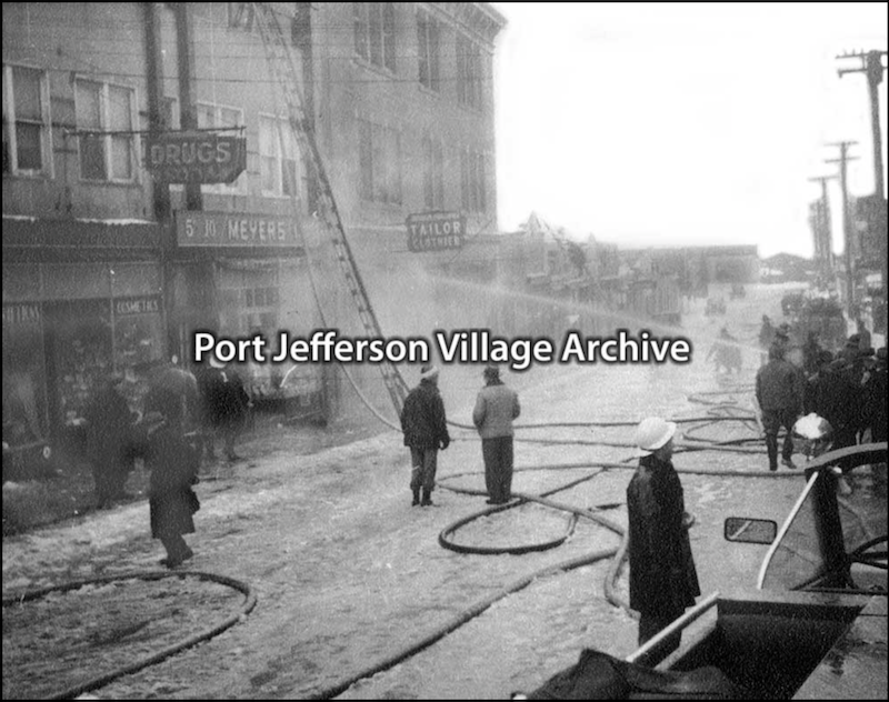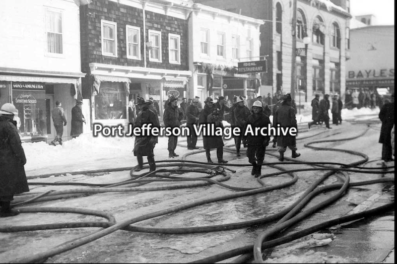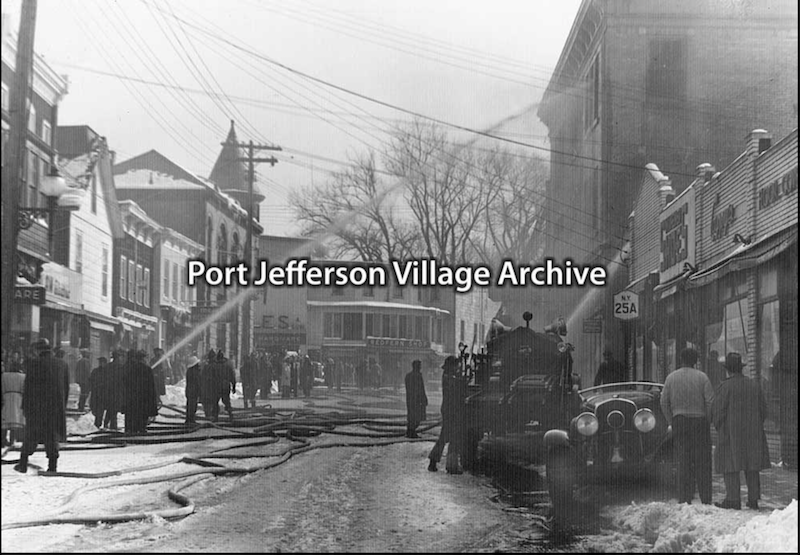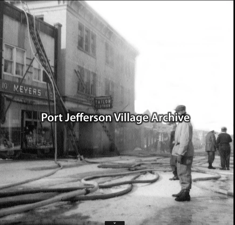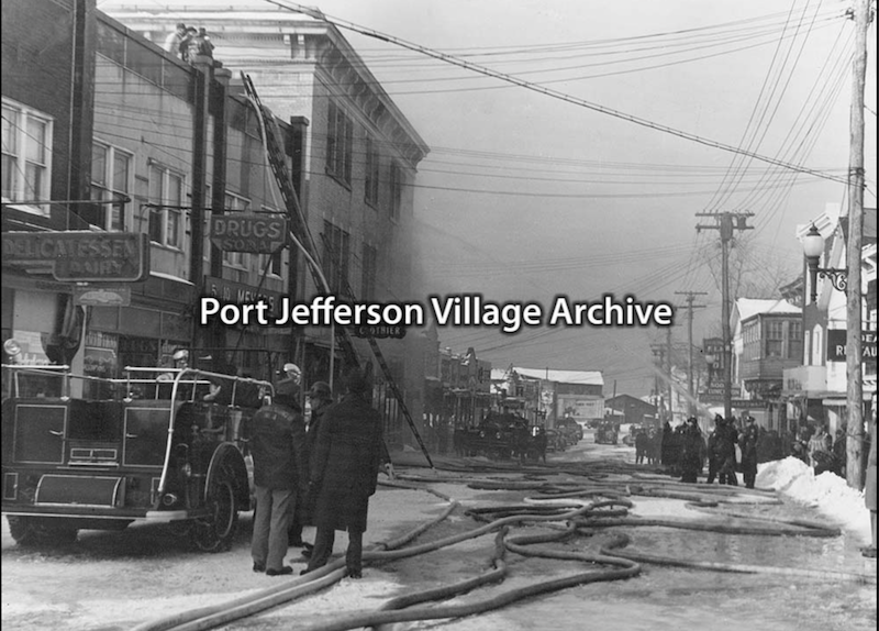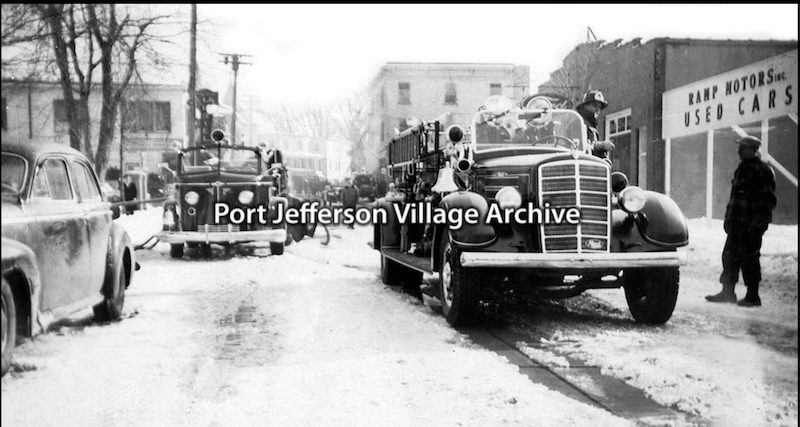 The building housed the Post Office, Justice Court, Scout Hall, offices and apartments. The ground floor rear was occupied by the Port Jefferson Record. The loss of printing equipment was considerable. All of the mail was saved and moved to a temporary post office in the Legion building. The building was owned by someone named Heyser. Fred Vopat, Ex-Chief of Stony Brook FD broke his ankle while laying hose and was taken to Mather Hospital. Setauket pumper drafted from the harbor and supplied Port Jefferson. Smithtown FD sent a Seagrave to replace Stony Brook at the scene on Tuesday and St. James sent a crew to Stony Brook to cover on Wednesday. 1-22-1948 Smithtown News. All photos are from the Port Jefferson Village Centennial Archives.