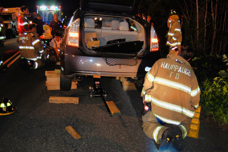 FD personnel in conjunction with police emergency services and ems from CI-Hauppauge Ambulance operated until 0041 hrs at which time the patient was extricated. Numerous pieces of equipment were used including floor jacks, air bags, come along and multiple pieces of cribbing.