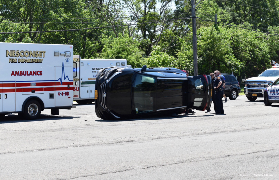 July 1, 2019 1214 hours. Nesconset Fire Department responds to Middle Country Road near Route 347 for a traffic collision. Units arrive to find a crash involving an SUV which overturned and was now resting on its side. All of the occupants exited the vehicle prior to the arrival of emergency personnel. All of the injuries were minor. Patients were transported via Nesconset Fire Department ambulance. Conor Ryan photo