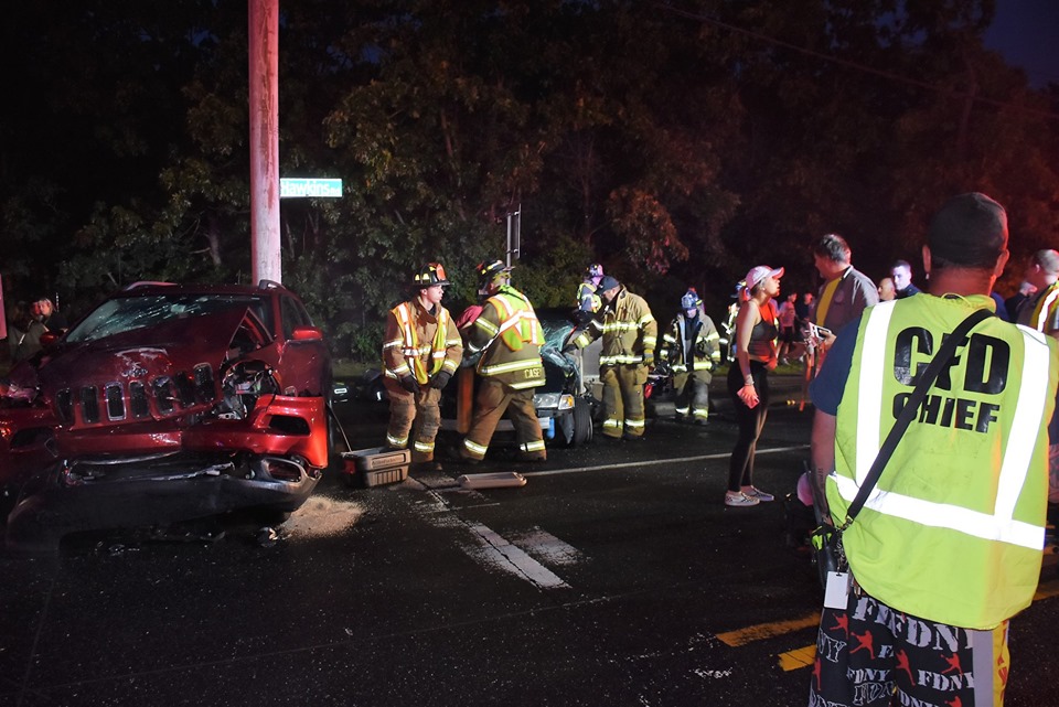 June 20, 2019 The Centereach Fire Department responds to Hawkins Road and Wireless Road in regards to a traffic collision. Units arrive to find a multi-vehicle crash with a subject trapped. FD personnel went to work to open the vehicle, while EMS personnel triage and treat the injured. Mutual aid was requested from the Setauket Fire Department for an ambulance. While en-route to this call, a Setauket Chief was involved in a separate traffic collision, eliciting a full response from his department. All of the injured were transported to the hospital via Centereach and Setauket FD ambulances. Photos courtesy of On Scene Photography.