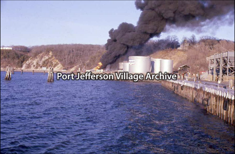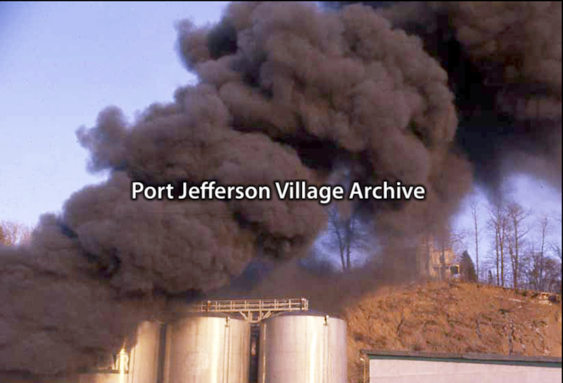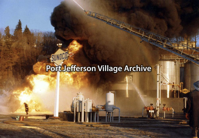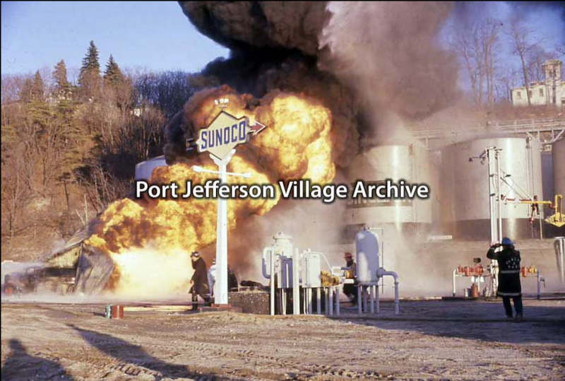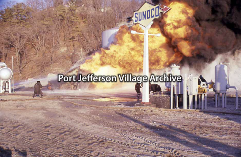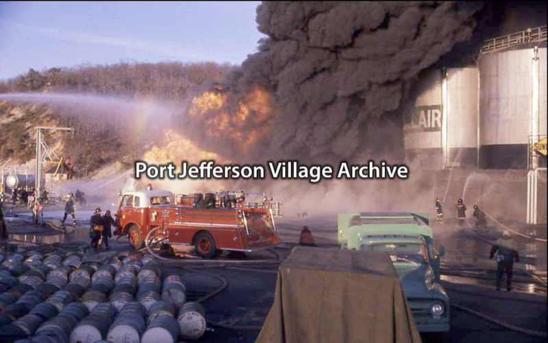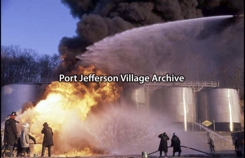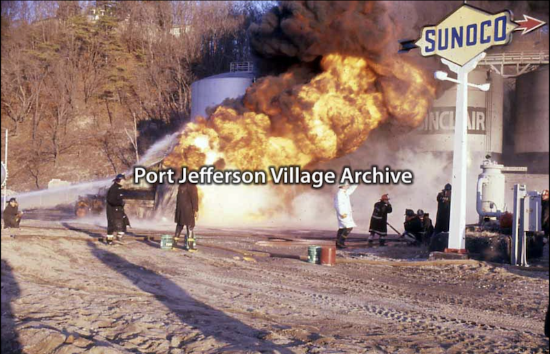 January 29, 1964 Alarm dispatched a t 1555 hours. Francis Lester drove his 2500 gallon tank truck into the loading shed of the Sinclair Installation where two other trucks were filling. The weather was clear, temp mild for the season, with a 15 mile wind out of the northwest. Lester later testified that he had shutdown his motor, grounded the truck and filled compartment one without incidnet. But when he started to load compartment two, the filler nozzle popped out of the hatch, sending a cascade of gas over the tank and the ground. While replacing the nozzle, Lester heard a loud pop and noticed that the front of his truck was burning. He ran to turn in the alarm while the other two drivers pulled out. Port Jefferson was assisted by Terryville, Setauket, St, James, Smithtown, Patchogue, Mt. Sinai, Stony Brook, Miller Place, Westhampton Air Base and Grumman Airport. The fire was extinguished at approximately 1815 hours. All photos are from the Port Jefferson Centennial Journal