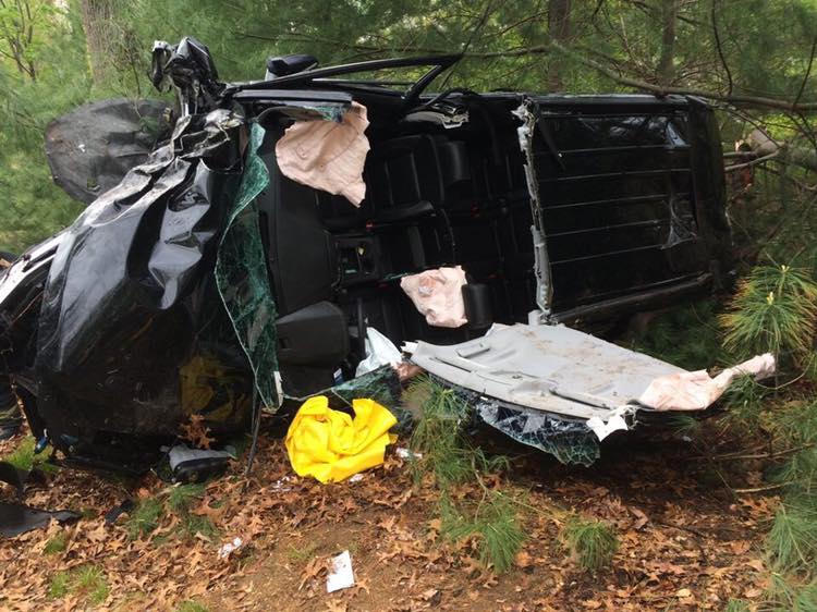 May 4, 2019 1508 hours. The Smithtown Fire Department was dispatched for an MVA with overturn and possible trapped occupant on River Road. First Assistant Chief Diecidue arrived on scene first and confirmed there was an overturned vehicle down an embankment off the road with the driver trapped in the vehicle. Rescue 4-2-9 arrived on scene and members began removing the roof with the aid of the crew of 4-2-4 in order to free the trapped occupant. The patient was extricated shortly after and was transported to the hospital by FD ambulance.