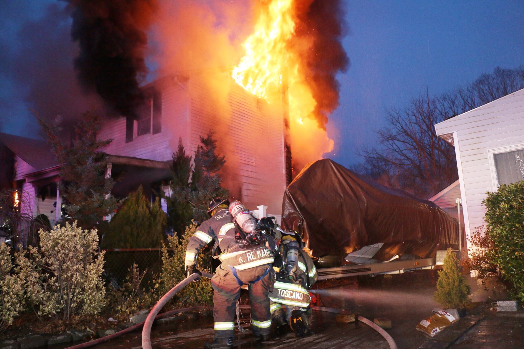 February 11, 2019 1720 hours. The Centereach Fire Department responds to 17 Minera Lane for a reported house fire. Units arrive to find heavy fire venting out of the upper level and through the roof of a two story wood frame home. Crews stretched two lines into the house and an additional line to protect a boat and a garage that the fire was impinging on. The fire was brought under control within an hour. Crews remained on scene until approximately 1920 hours. The cause of the fire is under investigation. There were no injuries. Selden and Ronkonkoma FD sent units to the scene. Farmingville FD sent an engine to Centereach FD Headquarters to cover. All images courtesy of Bryan Lopez (Emergency Patches) and OnScene Photography.
