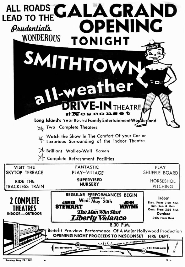 The Smithtown All Weather Drive-In was the second largest drive-in in New York with the largest being the Johnny All Weather Drive-In located in Copiague. The Smithtown All Weather Drive-In had a capacity for 2,500 cars and it also had an indoor theater. It was opened on May 29, 1962 with James Stewart in “The Man Who Shot Liberty Valance”. It was operated by Associated Prudential Theatres. Later it was another UA owned theater. It had one outdoor screen and one indoor screen. It was closed in 1985