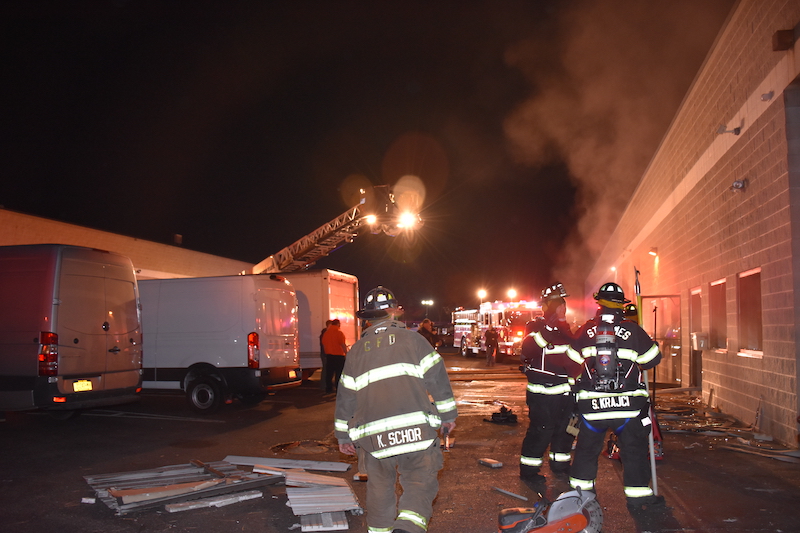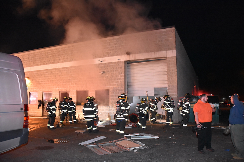 December 30, 2018 2222 hours. The Nesconset Fire Department is dispatched to on a telephone alarm from subject who states that a nest smoke detector activated in his suite within a single story multiple occupancy commercial building at 646 Middle Country Road. Firefighters arrived and found a light smoke condition within the suite. Crews searched further and found smoke within all twelve suites of the building. The alarm was reactivated as a working fire, bringing mutual aid in from St. James, Ronkonkoma, Centereach, Hauppauge, Smithtown, Lakeland, Nissequogue and Commack Fire Departments. Crews forced entry into all of the businesses and found an active fire in a wood shop on the east end of the building. The fire was extinguished with a 2½ inch line. Fire damage was confined to the one unit, which is occupied by a construction company. Smoke damage was light to moderate throughout the 220 foot by 100 foot building. Firefighters operated for approximately 90 minutes. There were no injuries. Fire Marshals from the Town of Smithtown Department of Public Safety handle the investigation. Photos courtesy of Lou Scannon.
