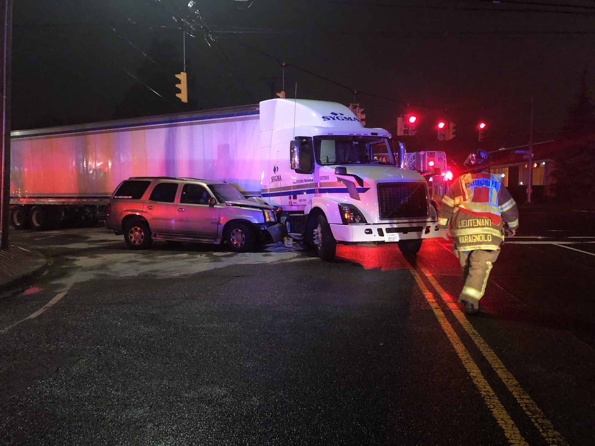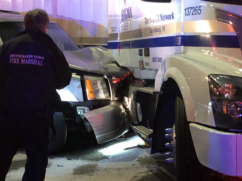 December 28, 2018 2206 hours. A tractor trailer making a turn onto southbound Hawkins Avenue from Portion Road collided with an SUV. The impact resulted in damage to the diesel fuel saddle tank on the passenger side of the tractor. The Ronkonkoma Fire Department responds to the scene and transports one adult male with non-life threatening injuries. FD personnel control the leak and call for the Town of Brookhaven Fire Marshals Office for their haz-mat team. Units operated at the scene for approximately 2 hours. The Ronkonkoma Fire Department handled two additional alarms while operating at this scene. Photos courtesy of Buff N Stuff.