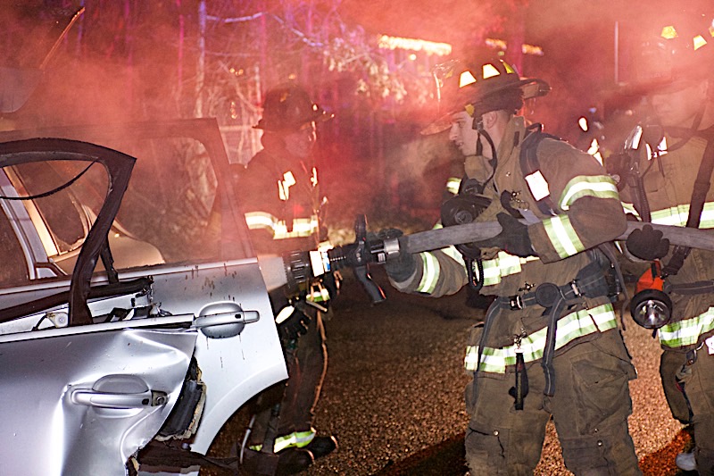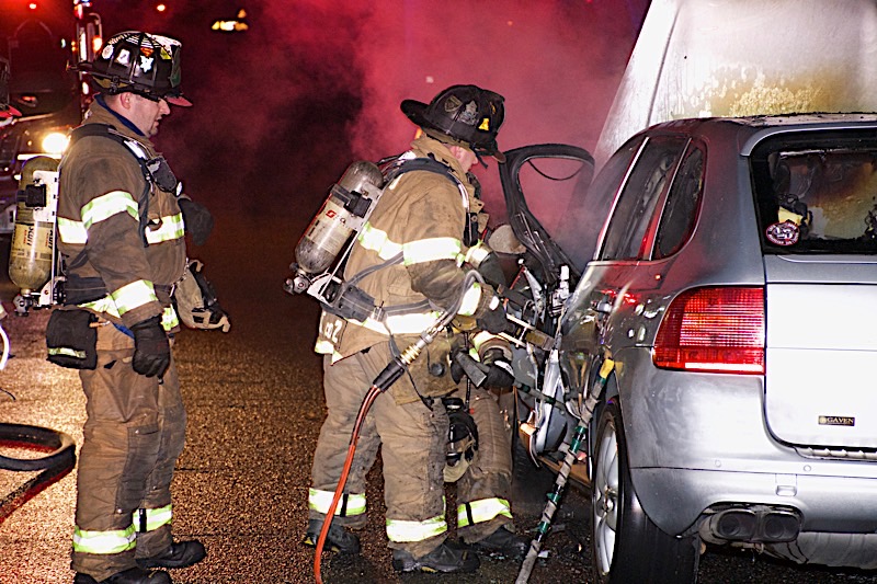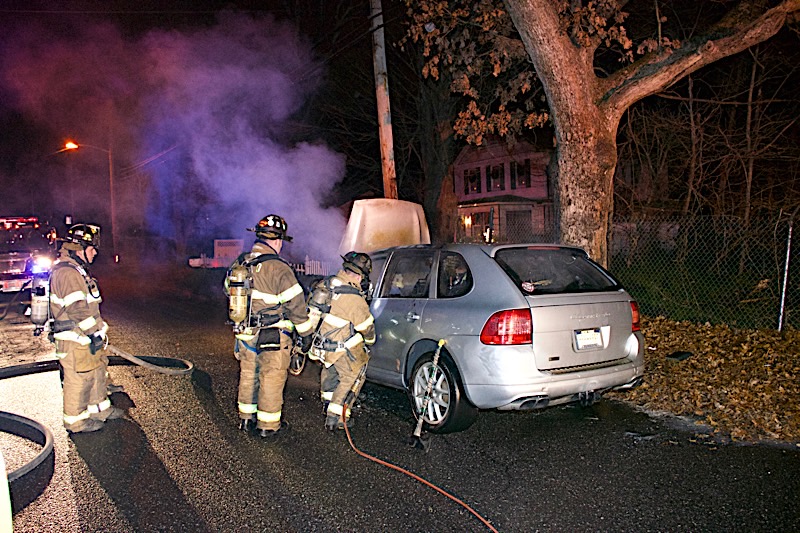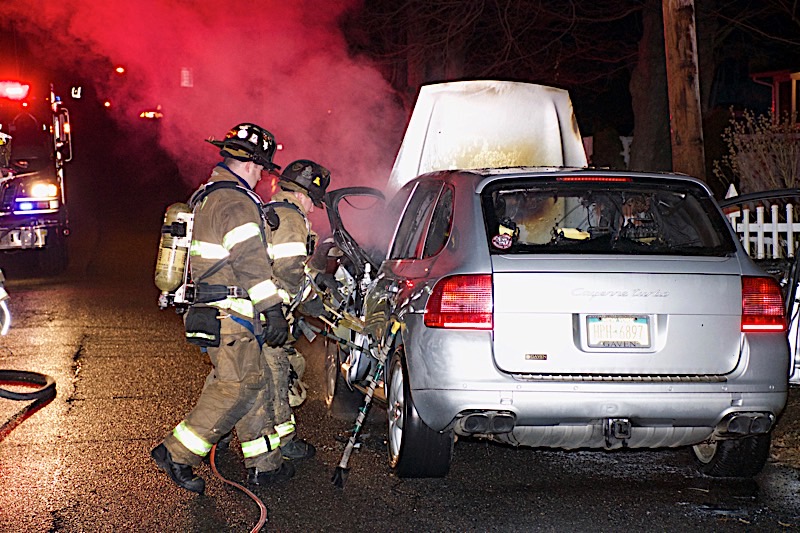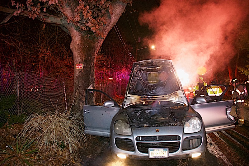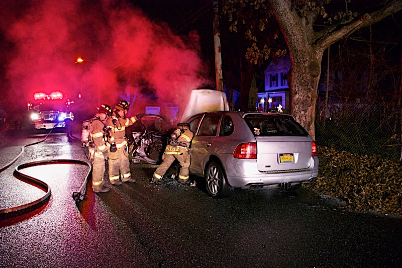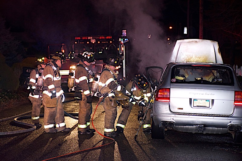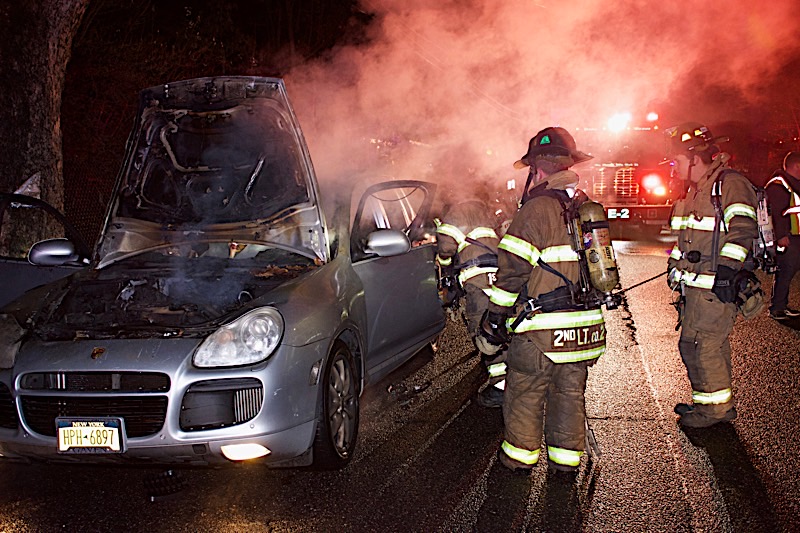 December 13, 2018 1750 hours. Centereach Fire Department responds to a report of a car fire on Wood Road, north of Middle Country Road. Units arrive to find a Porsche Cayenne Turbo burning in front of 42 Wood Road. Chief of Department Robert Corley operated with Engines 2, 9 and Fire Police. Crews used hydraulic tools to enter the passenger compartment to extinguish the fire. There were no injuries. Photos courtesy of Lou Scannon.
