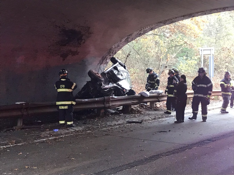 November 20, 2018 1022 hours. The Commack Fire Department was dispatched with CVAC, SCPD and the NYS Police to a traffic collision on the Northern State Parkway. Units arrived to find the a single vehicle had left the roadway, stoking a number of signs and a pole, overturned, landing upside down between the guardrail and the inside wall of the New Highway overpass. The lone occupant was ejected and was pronounced dead a the hospital. The westbound Northern State Parkway was closed for a few hours for the State Police investigation.