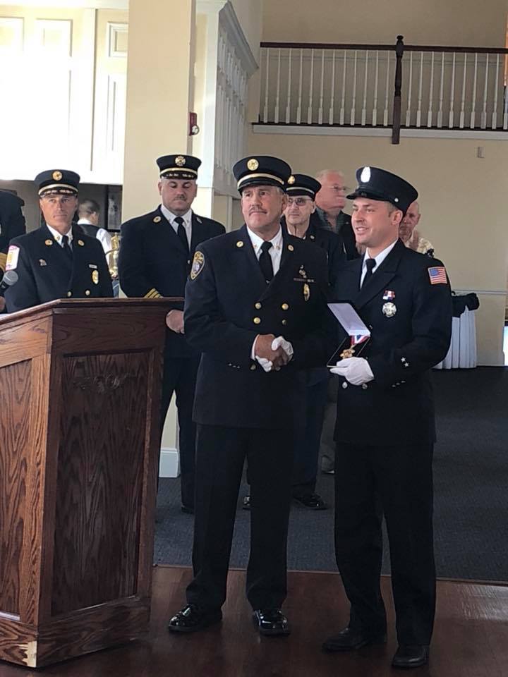 October 1, 2018 Hauppauge Engine 4 firefighter Steve Matteo received the Islip Town Fire Chiefs Association Medal of Valor for his part in the rescue of an adult male trapped in a traffic collision with vehicle fire on Townline Road on 7-19-2017. Congratulations Steve.