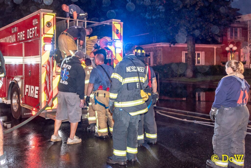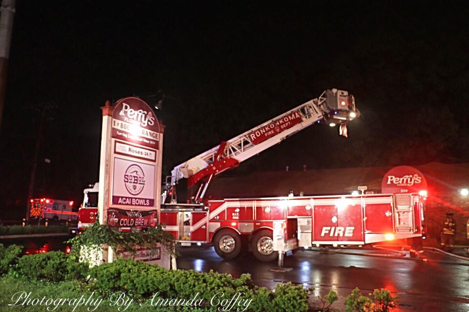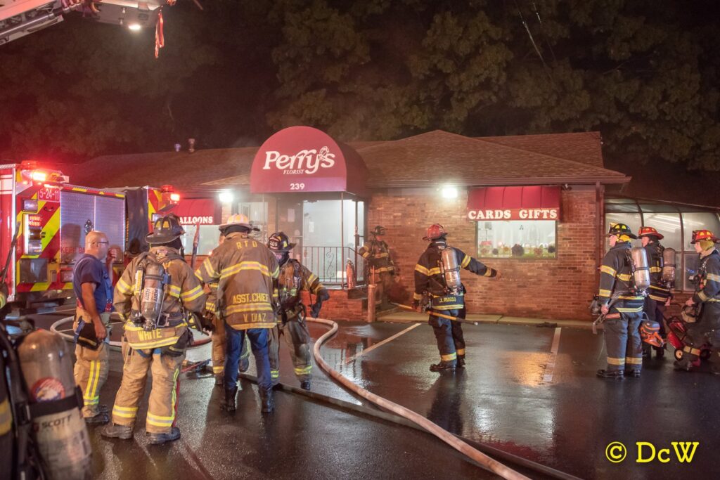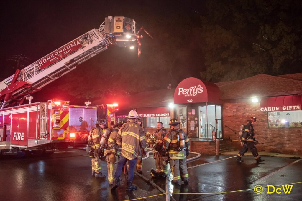 September 11, 2018 0510 hours. Ronkonkoma Fire Department responds to Perrys Florist 239 Hawkins Avenue for an activated fire alarm. Units arrive and find smoke pushing from a single story commercial building. The alarm is re-toned as a structure fire and the mutual aid plan is initiated, bringing in the Lakeland, Nesconset and Holtsville Fire Departments. Crews forced entry, stretched two lines and after a search, located and extinguished the fire in the basement. There were no injuries. St. James Fire Department sent an engine to cover for Ronkonkoma for the duration. Fire Marshals from the Town of Brookhaven are handling the investigation.Photos courtesy of Amanda Coffey and Dennis Whittam.