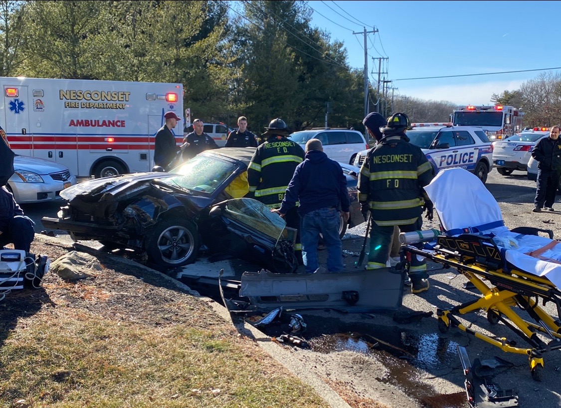 January 13, 2020 1259 Nesconset Fire Department responds to a traffic collision with injuries at Browns Road and Route 347. Units arrive to find a crash involving two vehicles with the operator of one pinned. FD personnel popped the drivers door on the convertible Ford Mustang and removed the occupant, who was then transported to the hospital. Photos courtesy of Conor Ryan.