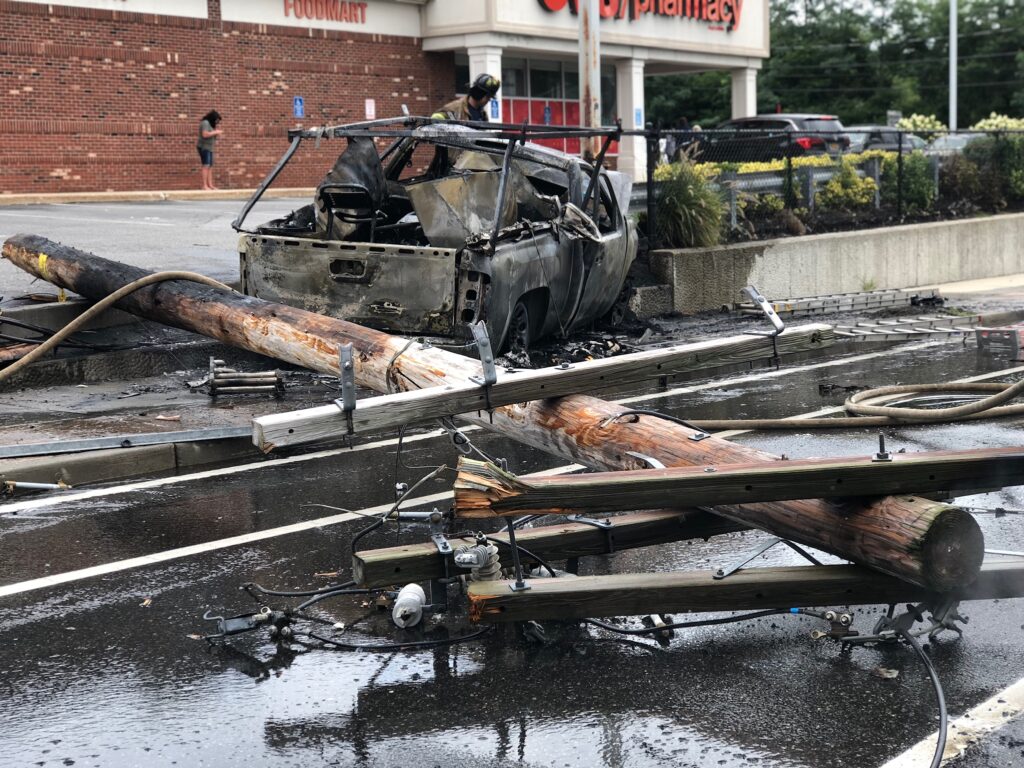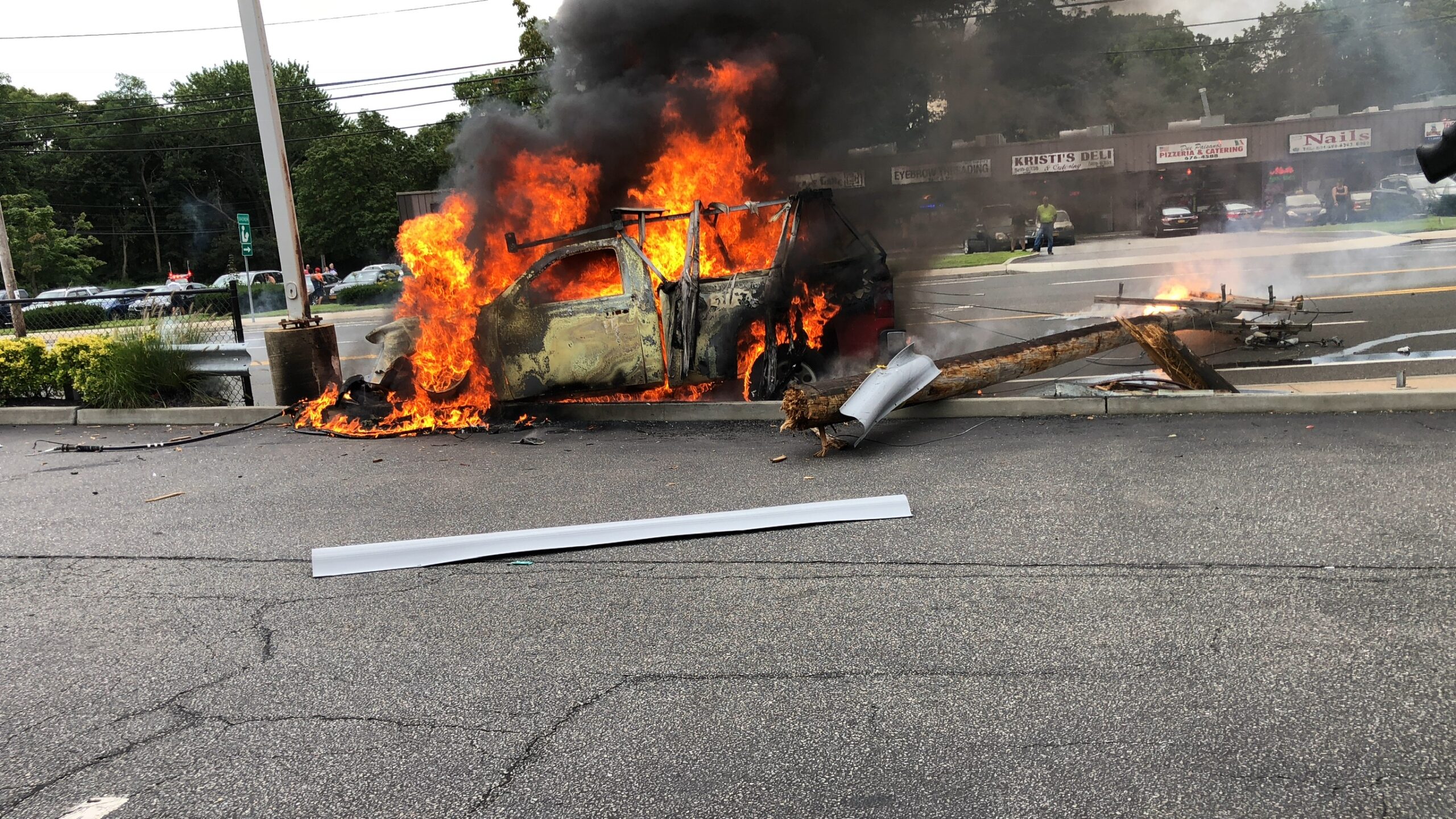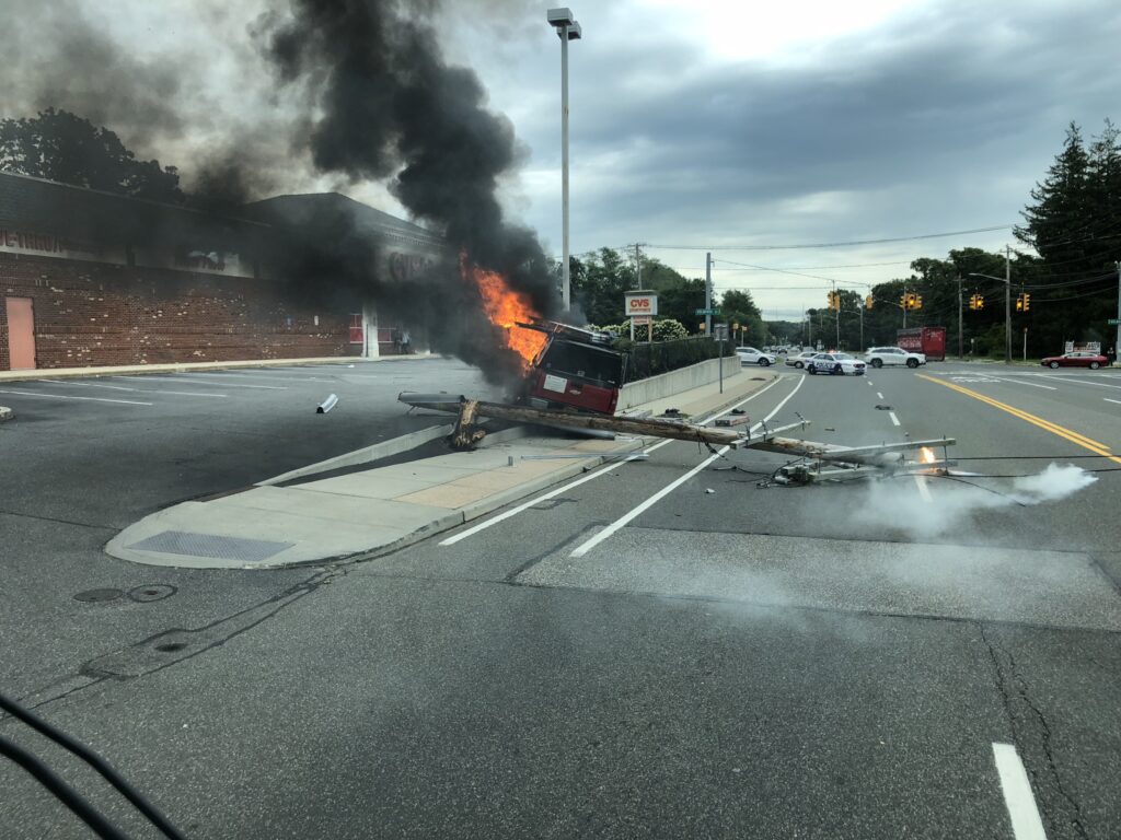 September 1, 2018 Ronkonkoma FD responds to a traffic collision on Portion Road near Holbrook Road. Units arrive to find that a truck left the roadway, striking a concrete light pole, but not before bringing down a utility pole and wires in front of CVS. Thankfully, the occupant of the vehicle self extricated as the crash resulted in a fire that destroyed the Chevy pickup truck. FD units stood fast until PSEG arrived and confirmed that power was removed from the wires. At that point the fire was extinguished. EMS handled patient care. The road was not reopened until some time later in the day to the the extensive cleanup and repairs by PSEG. Photos courtesy of the Ronkonkoma FD.