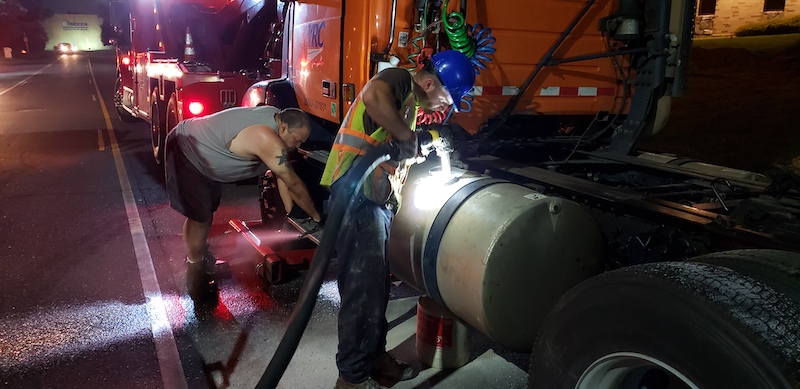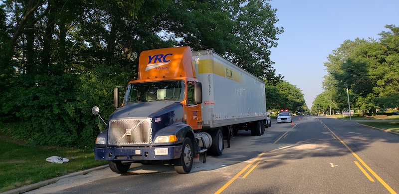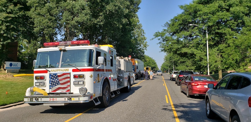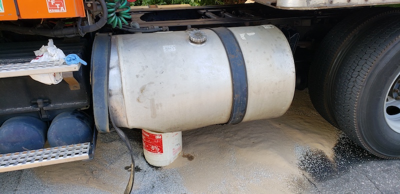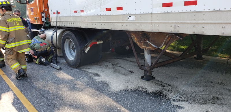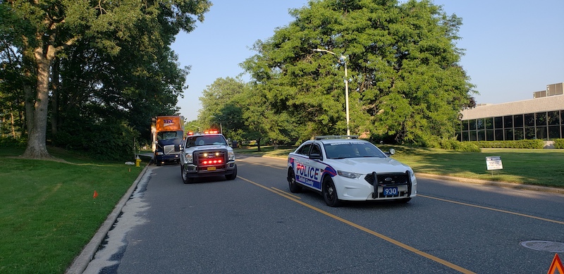 July 2, 2018 Hauppauge Fire Department responds to a truck leaking fuel on Arkay Drive. Units arrive to find that a tractor trailer struck a manhole cover which tore a hole in the drivers side fuel tank. The driver pulled over and called 911 while approximately 130 gallons of diesel fuel spilled into the roadway and down into the sewer system. FD personnel stopped the leak at the tank and shut down the fuel supply. Speedy dry was applied to the roadway and a sander was brought in from the Town of Smithtown Highway Department to cover the road with dirt. A Fire Marshal from the Town of Smithtown Department of Public Safety was called to the scene to handle the spill. The New York State Department of Environmental Conservation was also called in. Suffolk County Police Department Motor Carrier Safety Section came to the scene to inspect the truck.