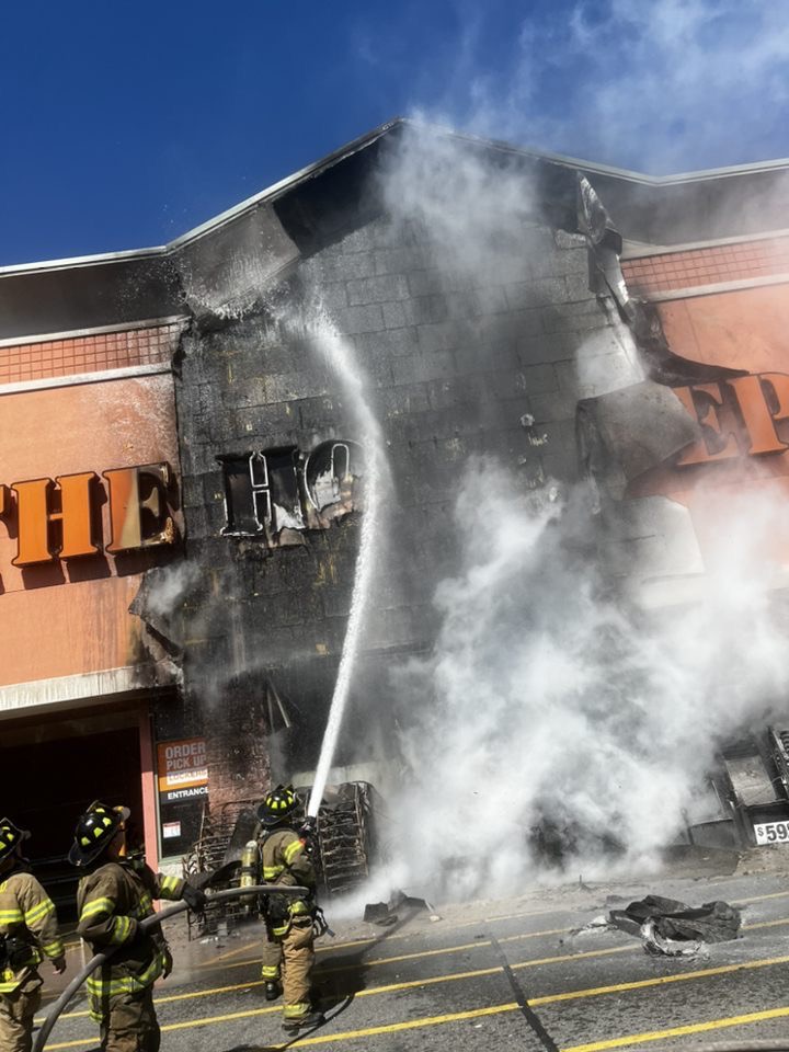 March 21, 2022 1230 hours. The Riverhead Fire Department is dispatched to a structure fire at the Home Depot store (1550 Old Country Road). Crews arrive to find furniture burning in the front of the store entrance. The fire is quickly extinguished on the exterior while the sprinkler system prevented any extension into the building. There were no injuries. The Riverhead Fire Marshal is handling the investigation along with Suffolk Police Arson Detectives. Photos via GroupMe.
