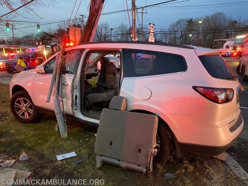 January 5, 2020 1620 hours. Commack Fire Department, Commack Ambulance and the Dix Hills Fire Department are all dispatched to a traffic collision with injuries at the intersection of Daly Road and Jericho Turnpike. Units arrived to find a crash involving multiple vehicles, one of which left the roadway and struck a utility pole. Personnel from the Commack and Dix Hills Fire Departments removed the two passenger side doors and the drivers side back door to allow Commack Ambulance personnel to enter the vehicle, stabilize the lone occupant and remove them from the vehicle. CVAC personnel evaluated the occupants of the other vehicles as well and thankfully only one party was injured. That subject was transported by CVAC ambulance to Southside Hospital. Commack Ambulance photos.