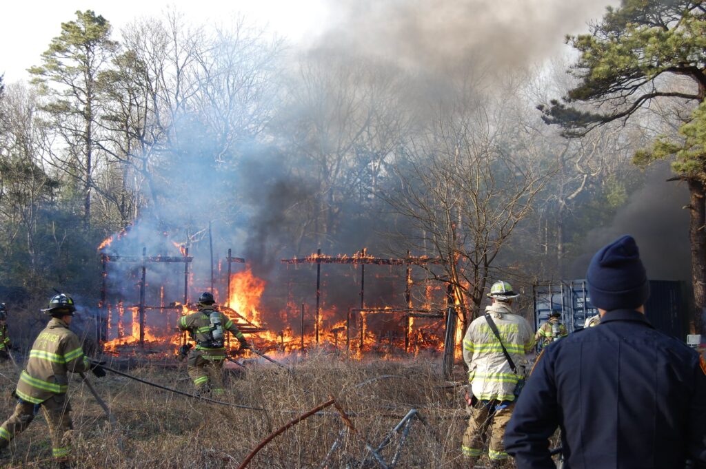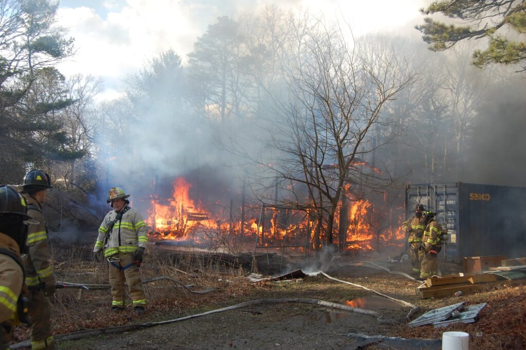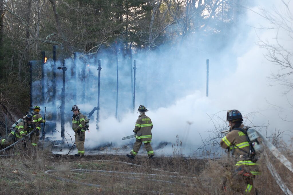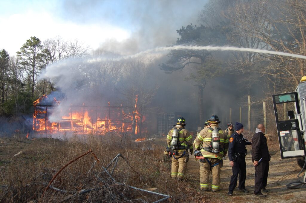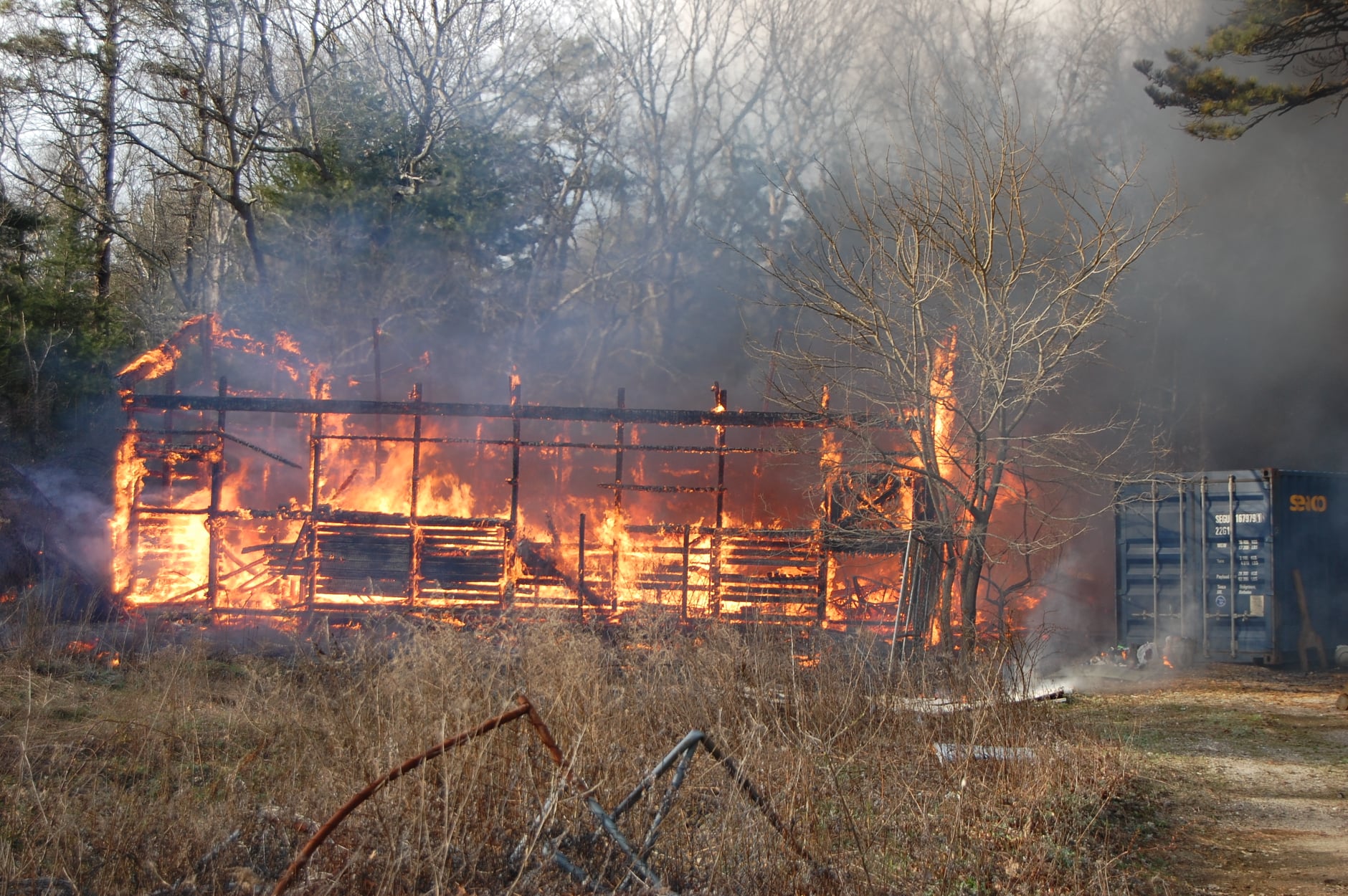 1726 hours. The Hauppauge Fire Department is dispatched to a report of a barn on fire behind 5 Settlers Road. Units arrived within four minutes and advised the dispatcher that they had a fully involved 25X35 barn burning on a large tract of land. The former horse barn was being used to store auto parts and accessories and had collapsed prior to the arrival of the fire department. The structure and contents were a total loss. Ray Germaine was Chief of Department and the OIC. Central Islip Hauppauge Ambulance stood by. The Smithtown Fire Department sent an engine to cover for the duration. Fire Marshals from the Town of Islip and detectives from the Suffolk County Police Department Arson Squad assisted the Hauppauge Fire District Fire Marshal with the investigation. Photos courtesy of 3840.