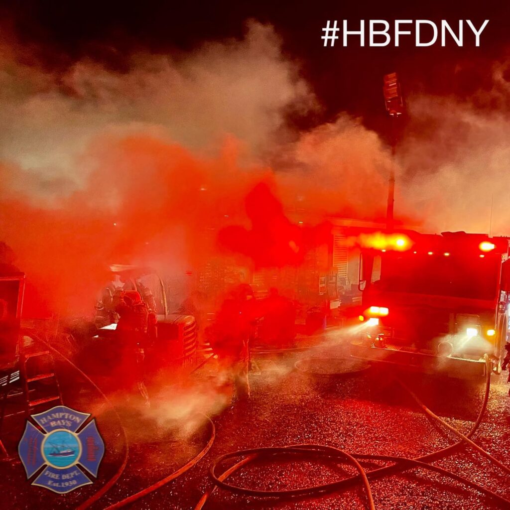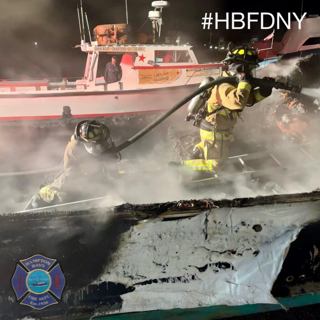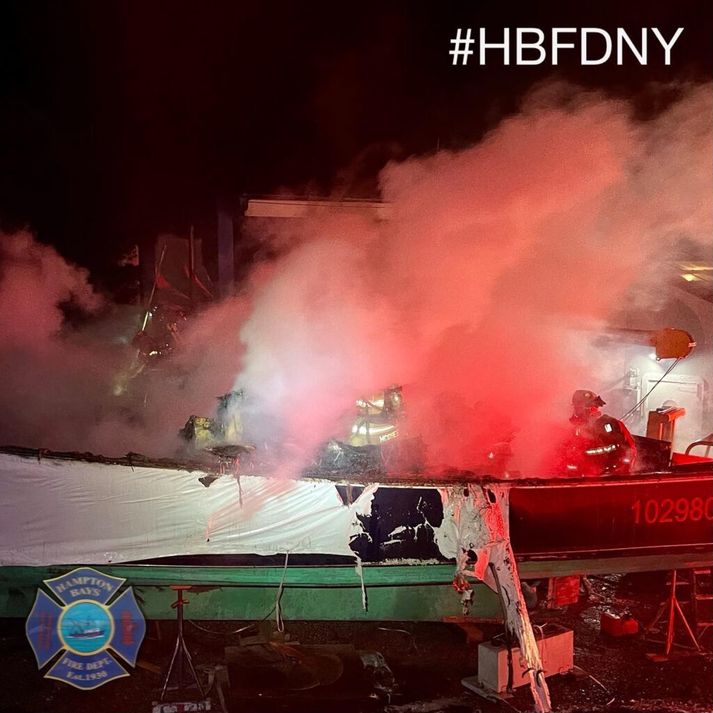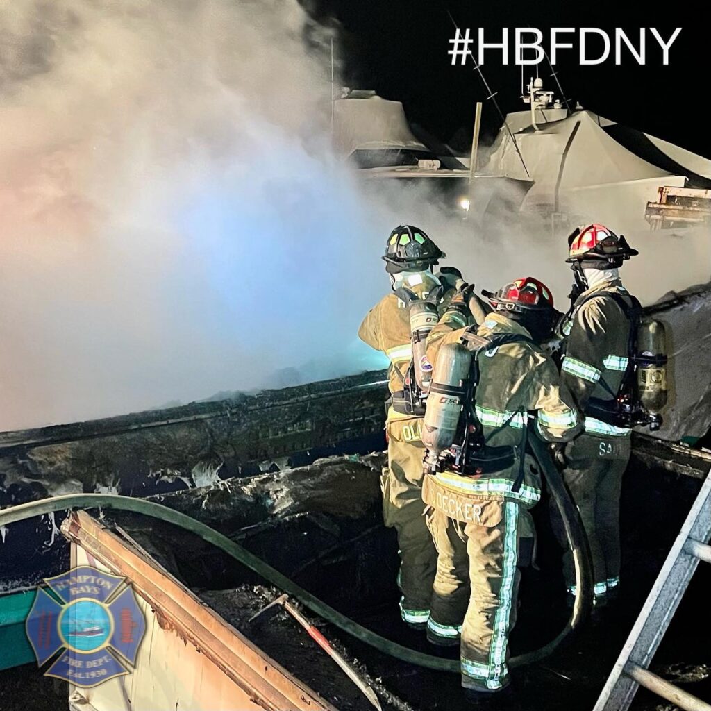 January 7, 2022. 0015 The Hampton Bays Fire Department was dispatched to a multi-boat and camper fire off of Foster Avenue. Upon arrival, Chief James Kappers confirmed that two large boats and a camper were fully involved. The firefighting crews of 7-5-2, 7-5-4 and 7-5-7 worked diligently to put out the multiple fires with limited mobility due to the close proximity of the boats. East Quogue Fire Department covered the district and Hampton Bays Volunteer Ambulance Corp sent units to the scene Southampton Town Fire Marshals are handling the investigation. Photos came from the Hampton Bays Firefighters Facebook Page.