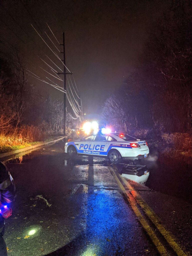 December 9, 2019 2048 hours. The Smithtown Fire Department was called to respond to Old Northport Road and Meadow Road in regard to people stuck in a vehicle in flood water during a heavy rain storm. Units arrived and found that the incident was further west on Old Northport Road, in the Kings Park Fire District. FD personnel in dry suits waded into the water and removed three subjects from two vehicles. There were no injuries. The roadway remained closed while crews from the Smithtown Highway Department pumped the water out. Photos courtesy of Lou Scannon.