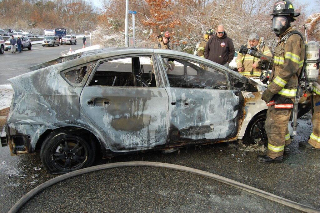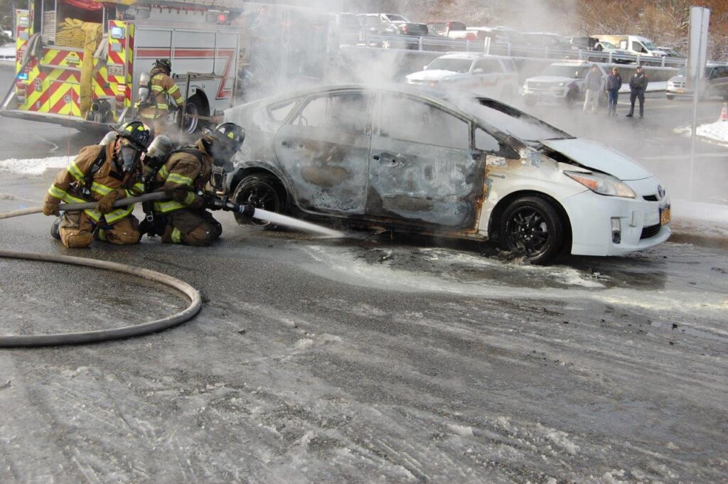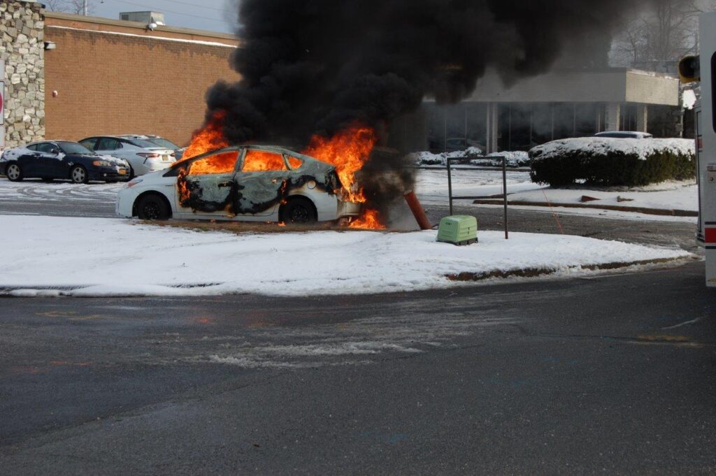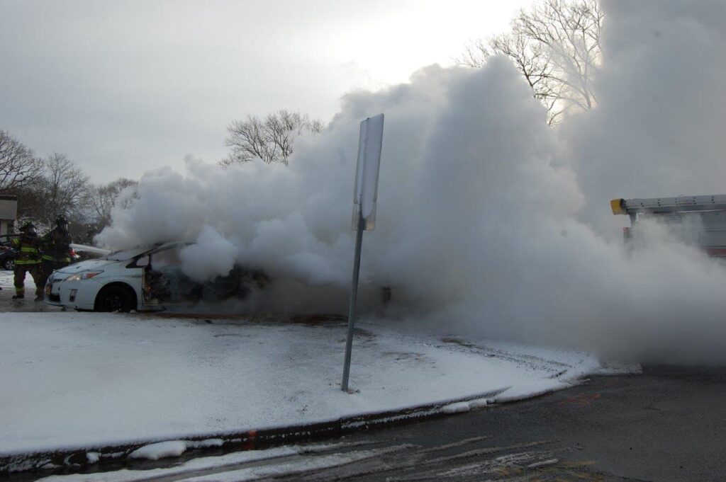 December 3, 2019 0839 hours. Hauppauge Fire Department responds to report of a vehicle on on Nicon Court at Rabro Drive. Units arrive to find a fully involved 2010 Toyota Prius hybrid that had just been parked in the street. The vehicle operator stated that she had parked the vehicle and went into work. She further stated that she came out to retrieve her glasses and noted fire in the steering column. Engines 3-8-4 and 13 operated at this incident under the command of Acting Assistant Chief Kenneth Furuno. The vehicle was a total loss. There were no injuries. Photos courtesy of 3840
