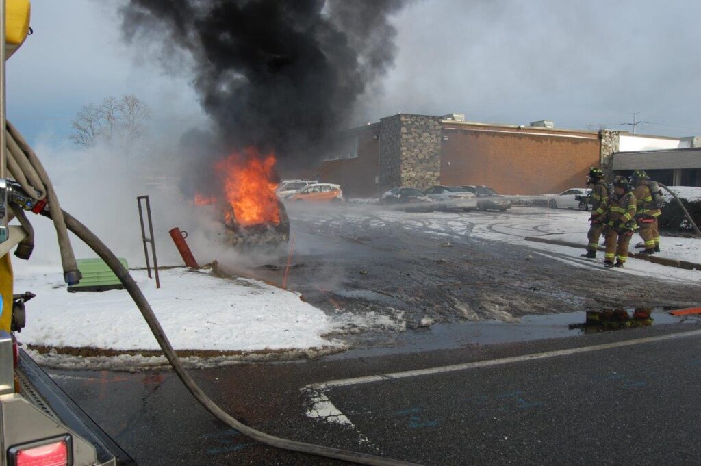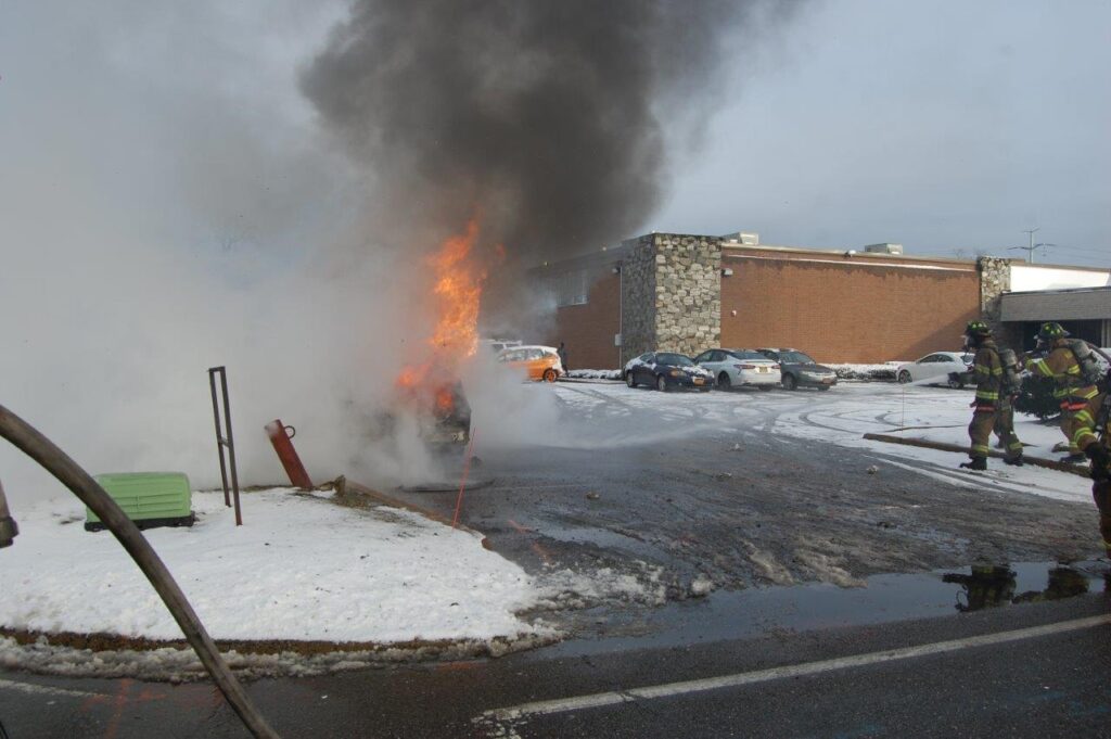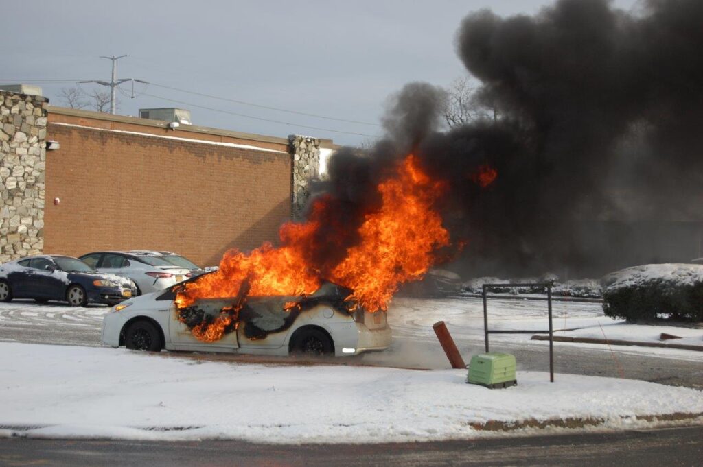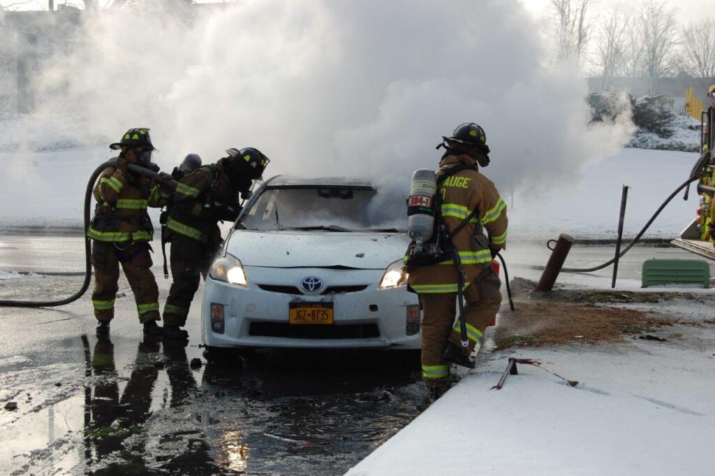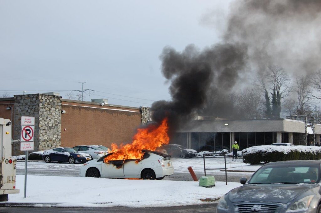 December 3, 2019 0839 hours. Hauppauge Fire Department responds to report of a vehicle on on Nicon Court at Rabro Drive. Units arrive to find a fully involved 2010 Toyota Prius hybrid that had just been parked in the street. The vehicle operator stated that she had parked the vehicle and went into work. She further stated that she came out to retrieve her glasses and noted fire in the steering column. Engines 3-8-4 and 13 operated at this incident under the command of Acting Assistant Chief Kenneth Furuno. The vehicle was a total loss. There were no injuries. Photos courtesy of 3840